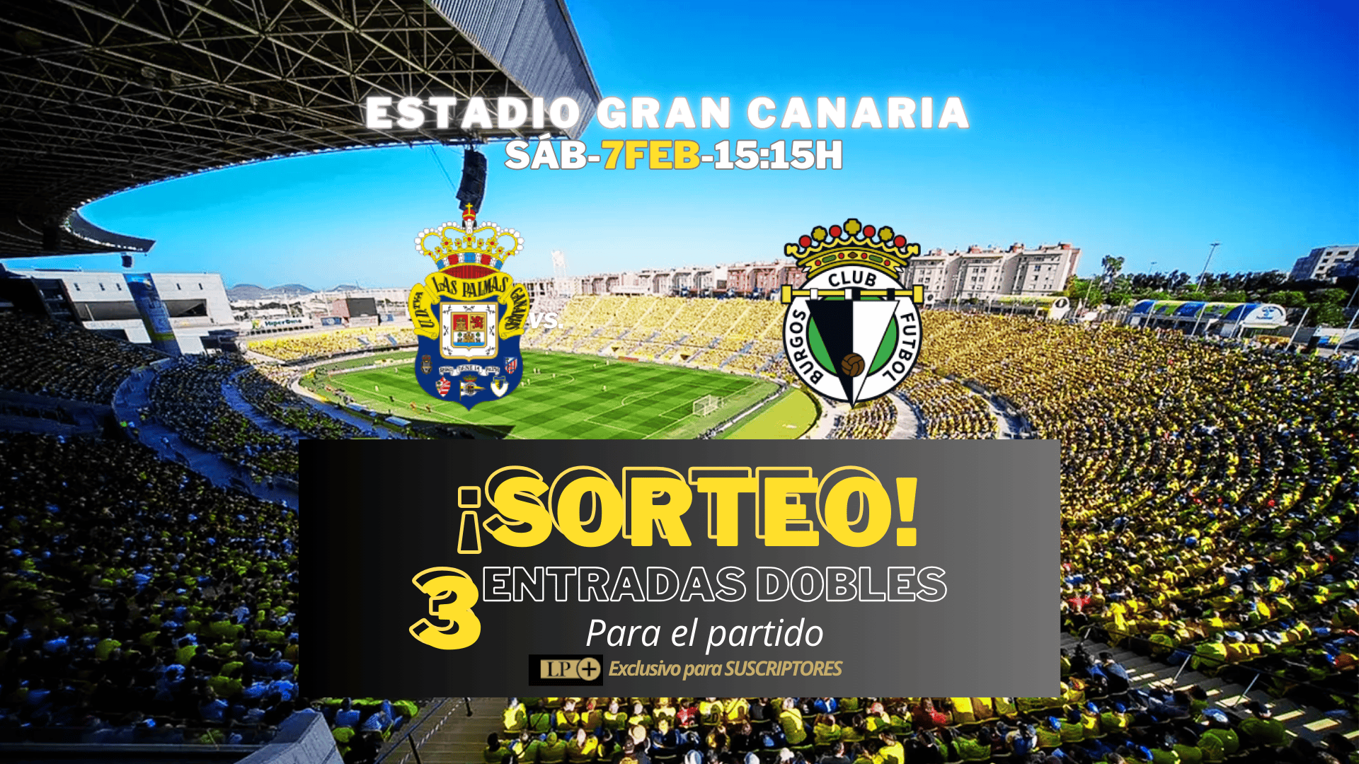te acercamos a la pasión del mejor fútbol que se vive en Canarias. El Estadio de Gran Canaria vuelve a ser escenario de un duelo de alto voltaje con el partido UD Las Palmas vs. Burgos CF, correspondiente a LALIGA Hypermotion, un encuentro que promete intensidad, emoción y un ambiente inmejorable en las gradas.El equipo amarillo regresa a casa con el objetivo de sumar tres puntos fundamentales, arropado por una afición que siempre marca la diferencia. La cita será el sábado 7 de febrero a las 15:15 horas, en una tarde que se anuncia cargada de energía, pasión y el inconfundible espíritu de Siete Palmas.Para que vivas esta experiencia desde dentro, LA PROVINCIA sortea 3 entradas dobles entre los suscriptores del Club. Una oportunidad única para disfrutar del fútbol en directo, compartir la emoción con quien tú elijas y animar al equipo desde la grada.💛 No te quedes fuera. Participa en este sorteo exclusivo para suscriptores y forma parte del espectáculo.⚽ Apoya a la UD Las Palmas y siente el fútbol como nunca.
